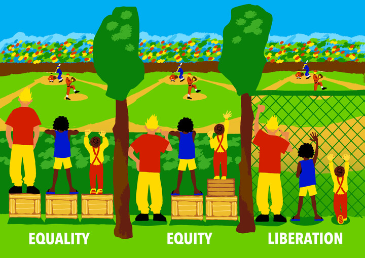 私たちの目標は、「登校できないことが生徒を苦しませない学校に変えていくこと」です。「平等」と「公正」の違いを示す比喩として、塀の向こうで行われている野球を見ようとする子どもたちのイラストがよく使われていますよね。背の高い子も低い子も皆が試合を観戦できるように、背の低い子には台を用意する。これが「公正な支援」の考え方だとされてきました。