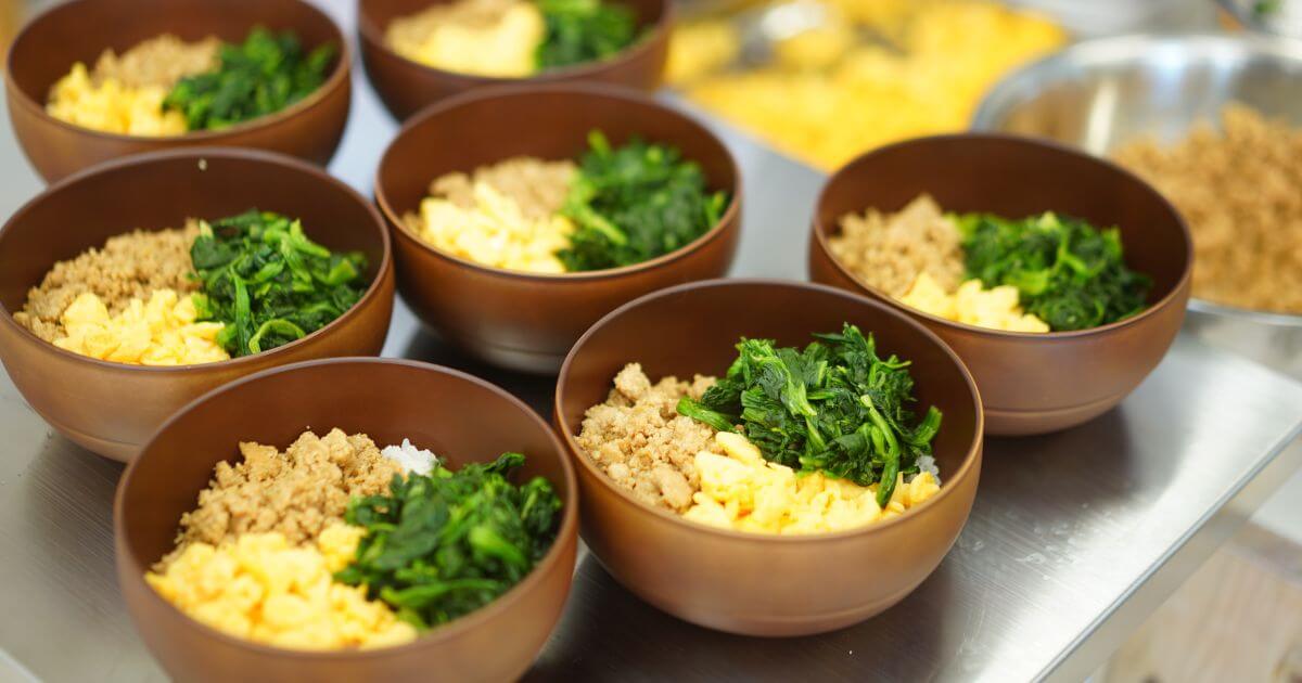 私たちは、毎日の食事を心と体の成長に欠かせないものとして、スクール内で手作り調理しています。食事は、管理栄養士さん監修のメニューをCoEクックさん(調理員さんのことを私たちはCoEクックと呼んでいます)が愛情たっぷりに作ってくれるのですが、開校初日は3色丼とお味噌汁というメニューでした。