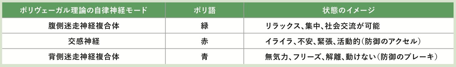 ポリヴェーガル理論の3つの自律神経のモードを、3色に分類して説明する方法。患者さんをはじめとする一般の人に分かりやすく説明するために、吉里さんが「赤・青・緑」と単純明快に説明していることから生まれた。これを吉里さん主宰の講座メンバーとの対話で「ポリ語」と呼び始め、定着した。
