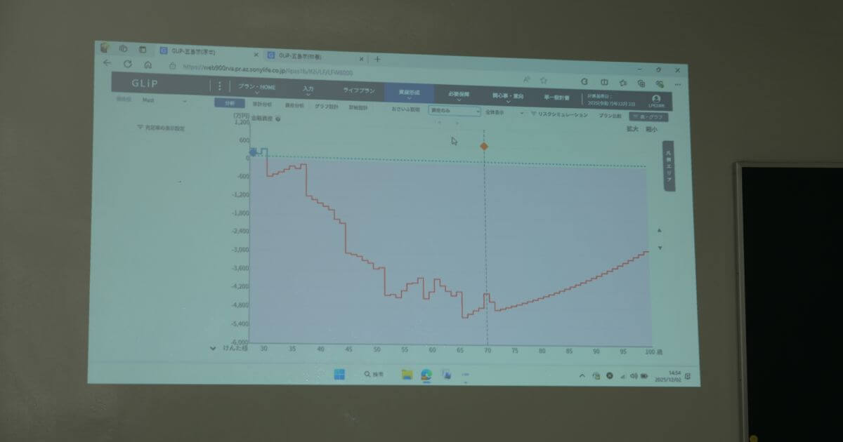 そして2時間目には、実際に生徒たちが立てたライフプランを検証していきます。ソニー生命のライフプランナーが実際にお客さまとライフプランニングをする際に使用している「GLiP」という専用シミュレーションソフトを使って、生徒たちが描いたライフプランを入力し、全体のお金の流れや生涯収支をグラフ化します。